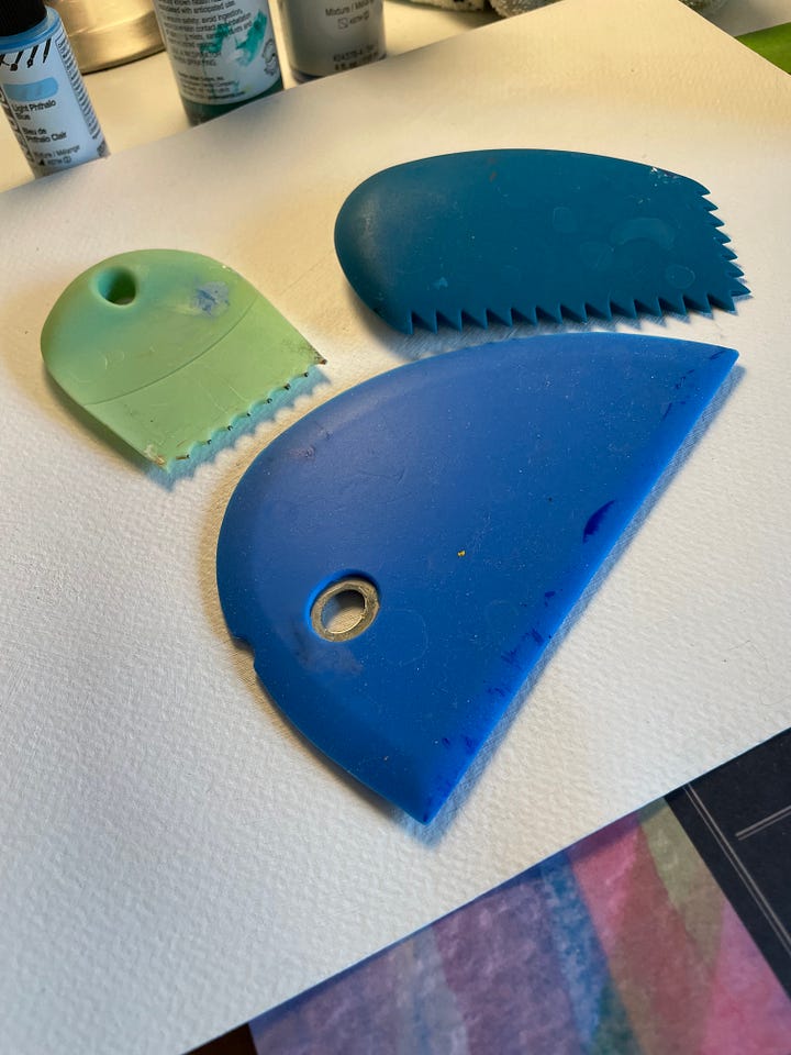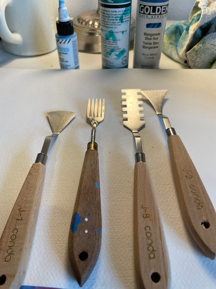 I’m working with differently shaped palette knives and silicon wedges that create distinctive marks. I’m intentionally not using brushes at all for this work. These instruments help me create the organic feel I’m going for. I love the unique marks I can get working with these tools.